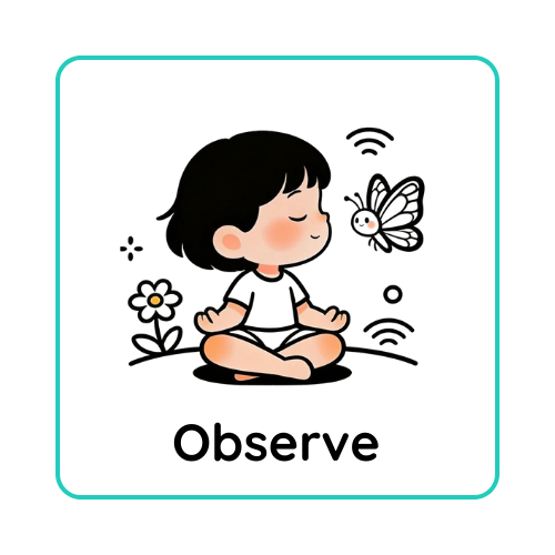 Observation helps our children develop present-moment awareness and reflective thinking. Whether watching ants, noticing a friend's emotions, or reflecting on experiences, observing builds mindfulness and metacognition – thinking about thinking. Children who practise observation show better attention, impulse control, emotional regulation, and reduced anxiety. They learn to pause before reacting and become more effective learners and problem-solvers.